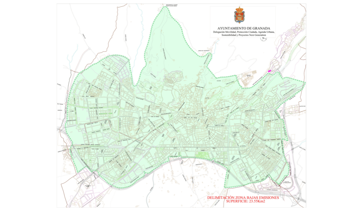 Mapa oficial de la ZBE de Granada: perímetro punteado y zona sombreada en verde; delimitación municipal y barrios; superficie 23,55 km²